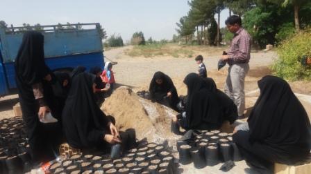 با نظارات و راهنمایی کارشناس شهرستان بانوان بسیجی از خزانه و گلخانه های نهالستان بازدید نموده و با نحوه تولید و مراقبت نهالهای گلدانی آشنا شدند و سپس با آماده سازی و قرار دادن بستر کشت شامل کود و ماسه ، پرلیت ، کوکوپیت در گلدان آنرا آماده کاشت بذر نمودند .