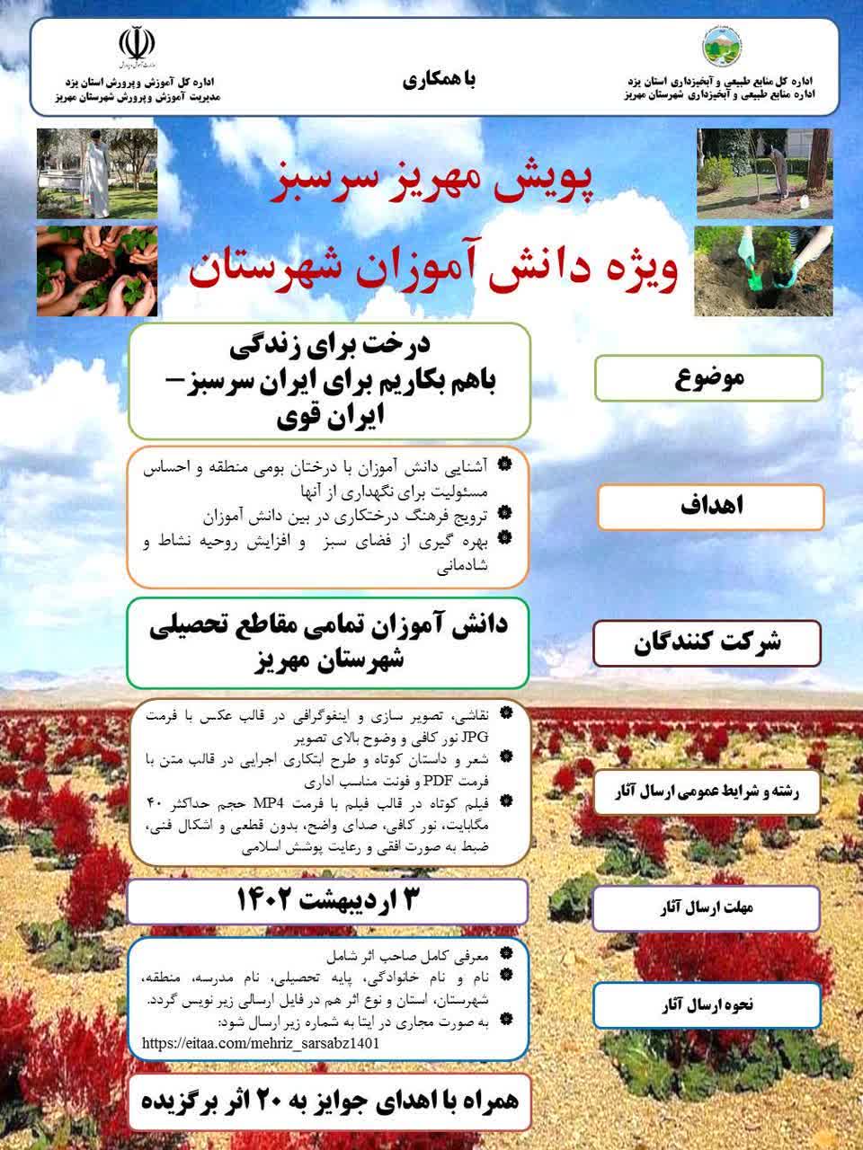 سرپرست اداره منابع طبیعی و آبخیزداری شهرستان مهریز در این باره گفت: این پوشش توسط اداره منابع طبیعی و آبخیزداری و آموزش و پرورش این شهرستان صورت گرفته و از روز درختکاری (پانزدهم اسفندماه) تا سوم اردیبهشت ادامه دارد.