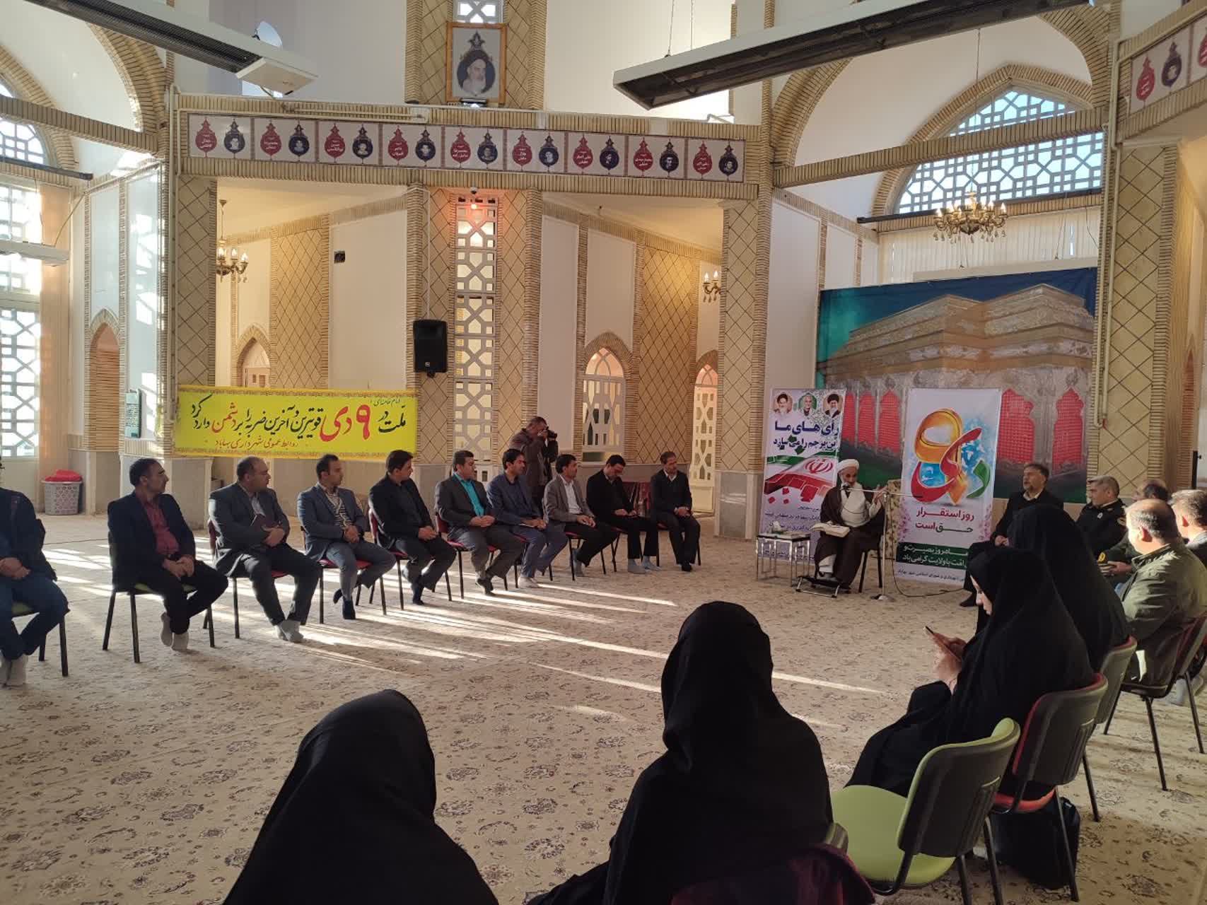 در این نشست امام جمعه محترم با گرامیداشت حماسه نهم دی و اهمیت آن بخشی از بیانیه گام دوم انقلاب را برای حاضرین تشریح کردند.