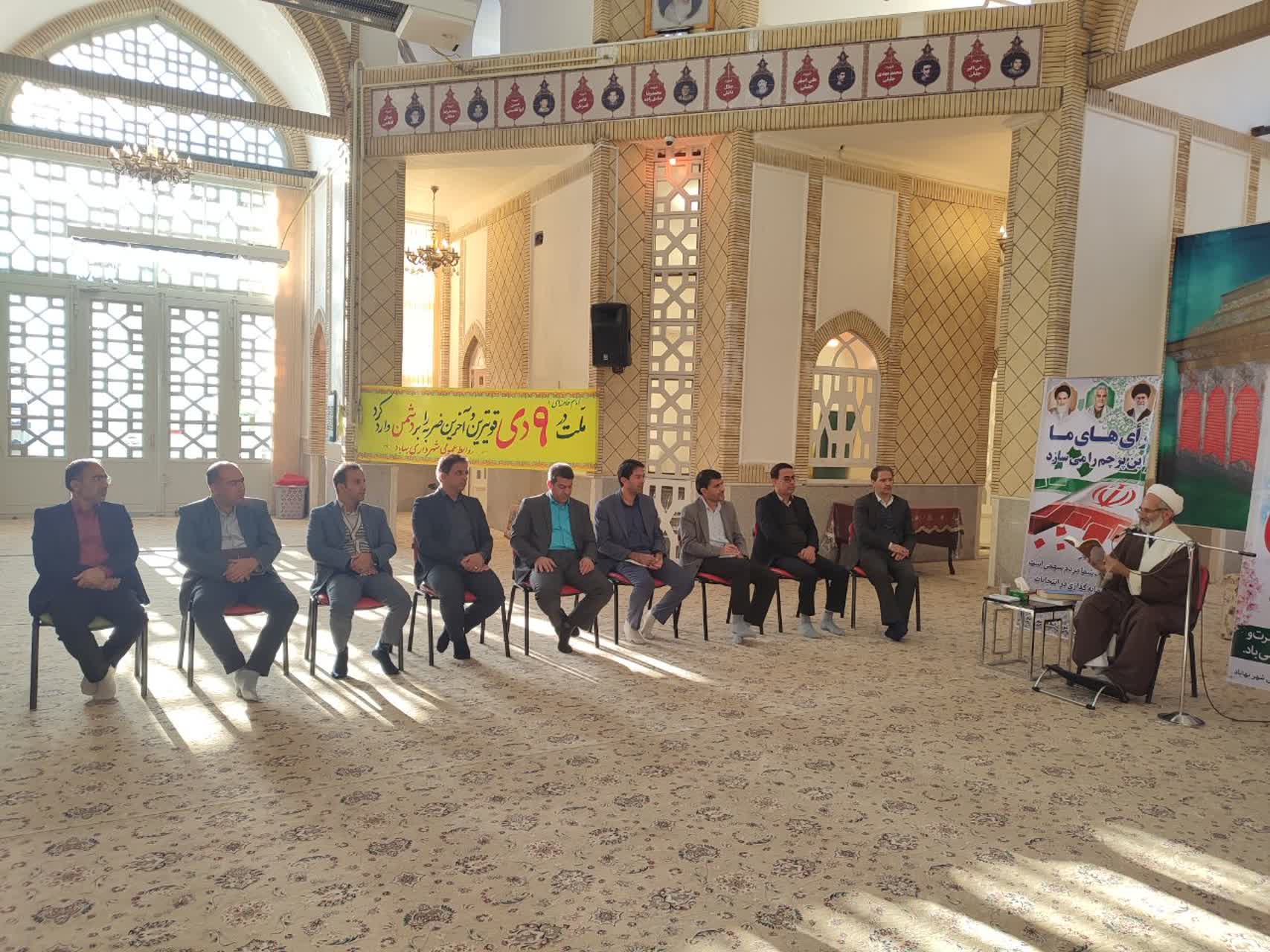 سومین نشست تبیینی گام دوم انقلاب در تاریخ 9 دی ماه سال جاری با حضور امام جمعه محترم، فرماندار و مسئولین محترم ادارات شهرستان بهاباد در محل حسینیه گلزار شهدا برگزار شد.