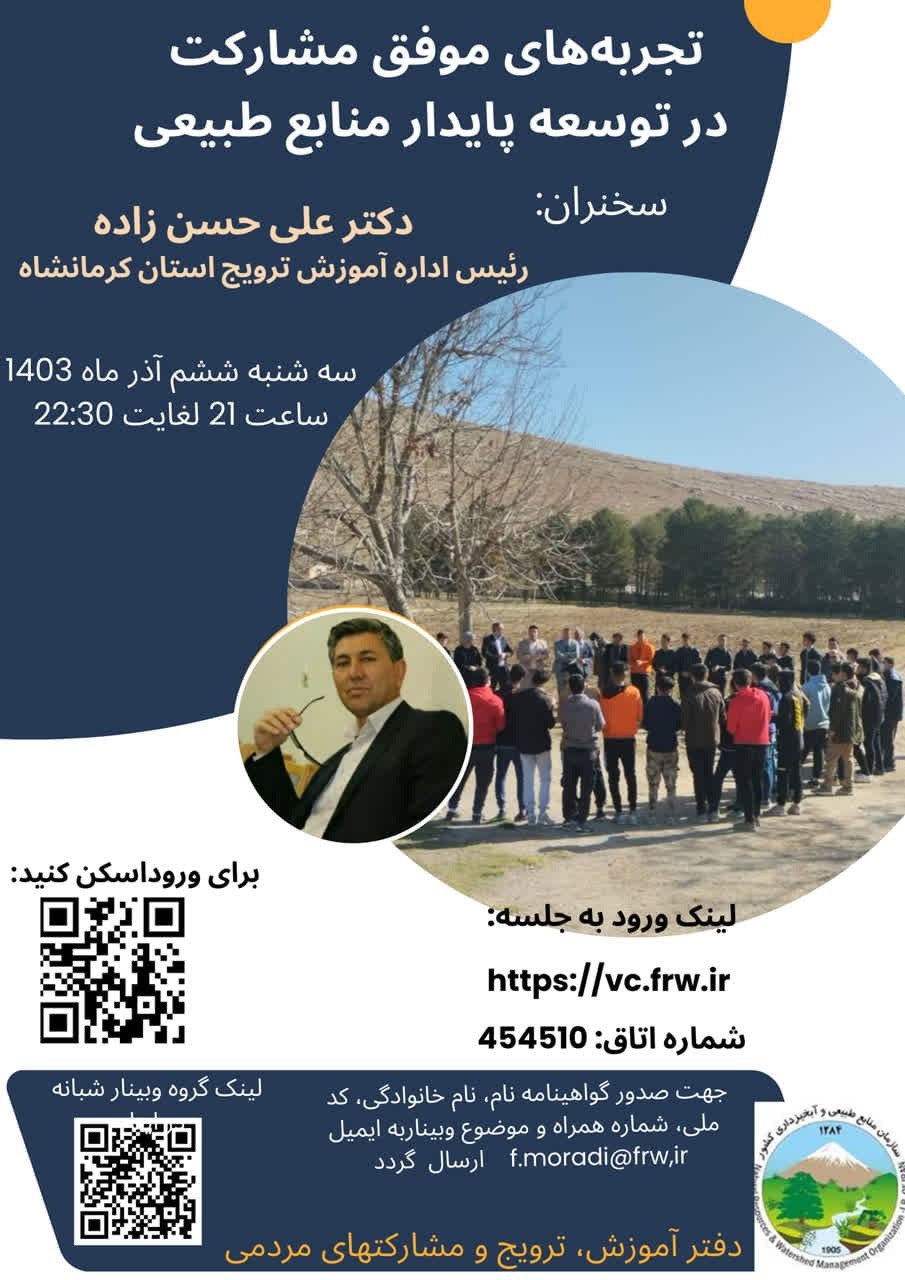 فتـر آموزش، تـرویج و مشـارکتهای مـردمی سازمـان منابع طبیعی و آبخیـزداری کشـور وبینار تجربههای موفق مشارکت در توسعه پایدار منابع طبیعی را بـرگزار می کنـد